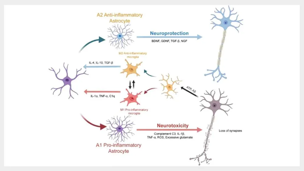 In Krankheitszuständen verändert sich jedoch das Verhalten beider Zelltypen erheblich. Mikrogliakörper scheinen von einer überwachten Homöostase zu entzündlichen Zuständen überzugehen, während Astrozyten reaktive Phänotypen annehmen können, die sowohl neuroprotective als auch neurotoxische Eigenschaften aufweisen.